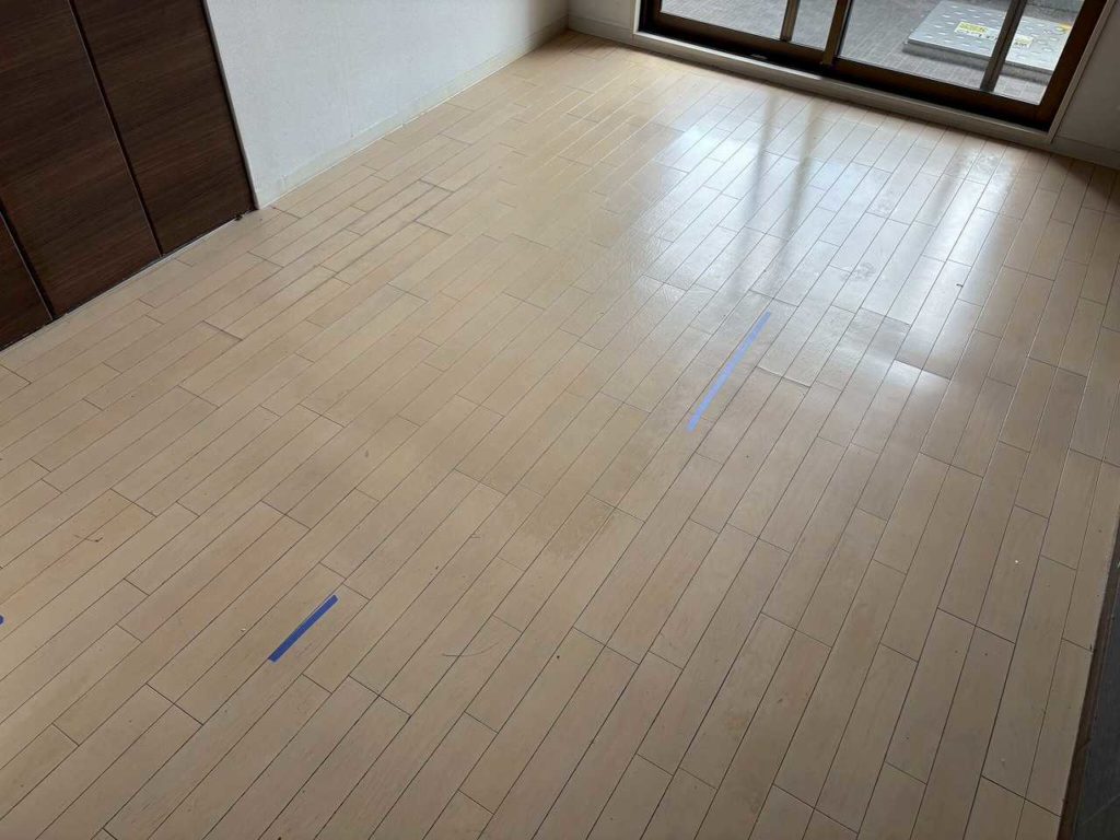 既存のフローリングは傷や色あせがあり、照明の反射が弱く、部屋全体が暗く感じられる状態でした。